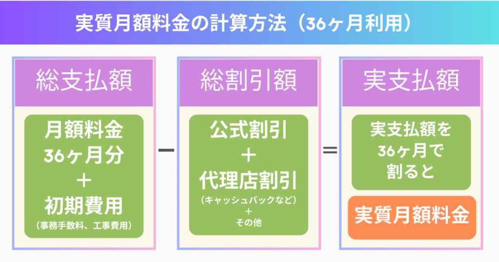 まず、月額料金36ヶ月分に初期費用(工事費・事務手数料など)を加えた「総支払額」を出します。次に、キャッシュバックやキャンペーンなどの割引をすべて合計した「総割引額」を差し引くことで、「実支払額」が算出されます。最後に、この実支払額を36ヶ月で割ることで、本当の月額コストである「実質月額料金」が分かります。